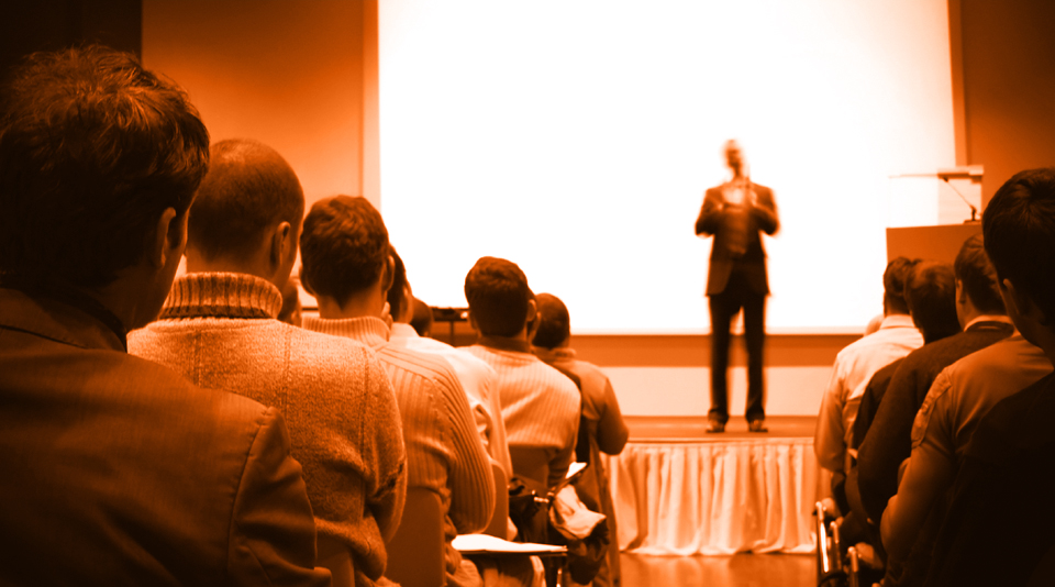 Ein Firmenrepräsentant steht vorne am Beamer, erzählt etwas von